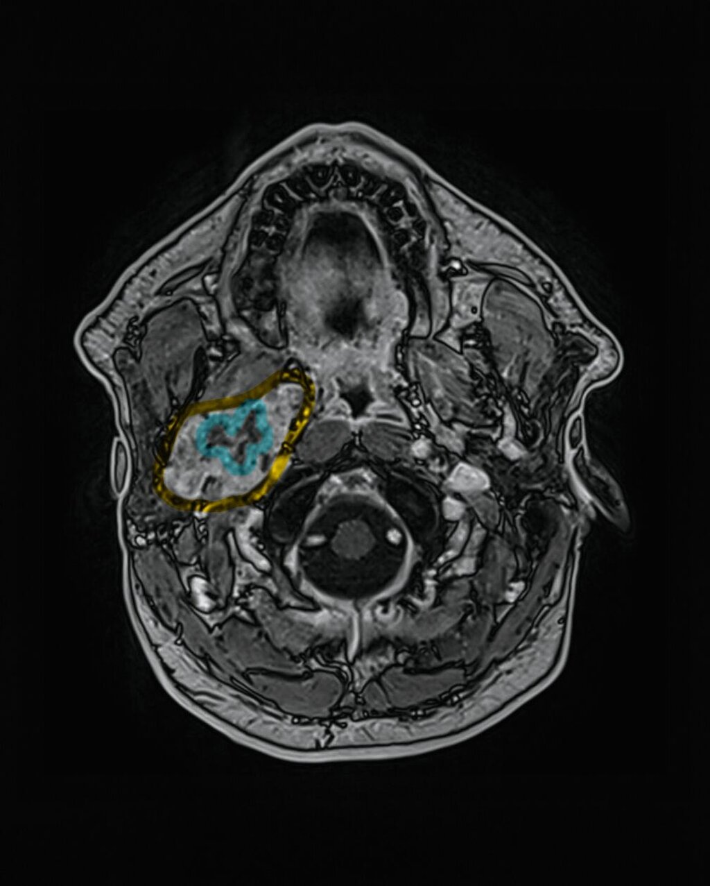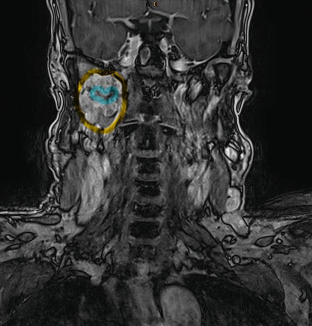 Ein 58-jähriger Patient stellte sich im Dezember 2025 nach auswärtiger Bildgebung in unserer Klinik vor. Anlass war eine MRT-Untersuchung der Halswirbelsäule bei persistierenden Beschwerden der oberen Extremität nach einem Arbeitsunfall. Klinisch bestanden präoperativ weder extra- noch intraorale Auffälligkeiten, insbesondere keine Schmerzen, Schwellungen oder funktionellen Einschränkungen.
