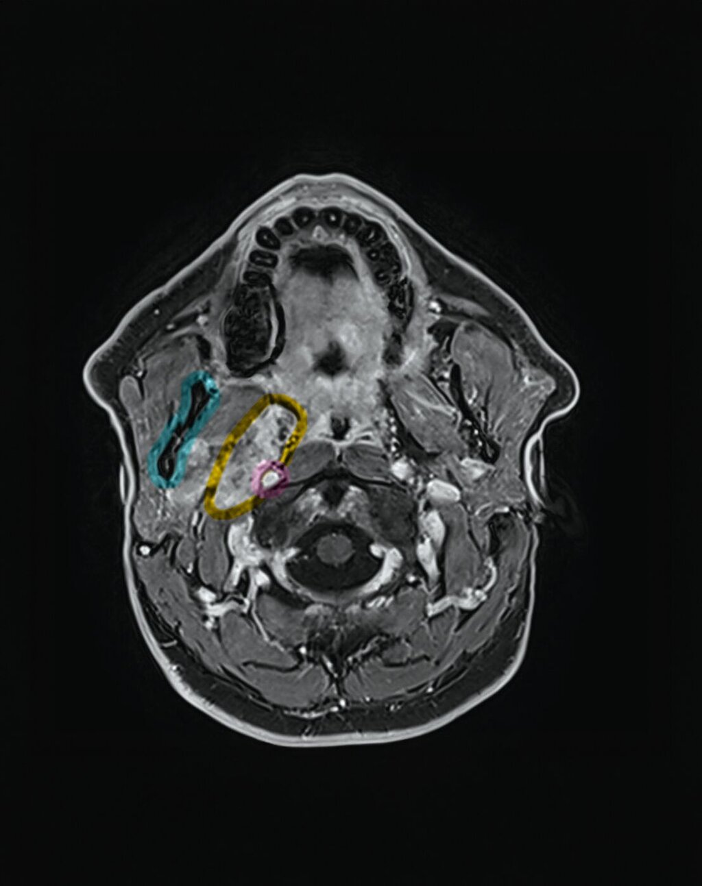 In der extern durchgeführten MRT der Halswirbelsäule vom 18. Dezember 2025 zeigte sich randständig eine angeschnittene Raumforderung im rechten Parapharyngeal- und Mastikatorraum, so dass eine gezielte weiterführende Bildgebung veranlasst wurde. Die kontrastmittelgestützte MRT vom 30. Dezember 2025 ergab eine inhomogene, gut abgrenzbare Raumforderung im rechten Parapharyngeal- und Mastikatorraum mit einer maximalen axialen Ausdehnung von 52 mm x 28 mm.