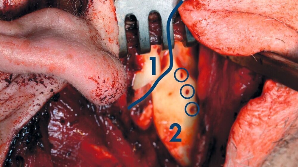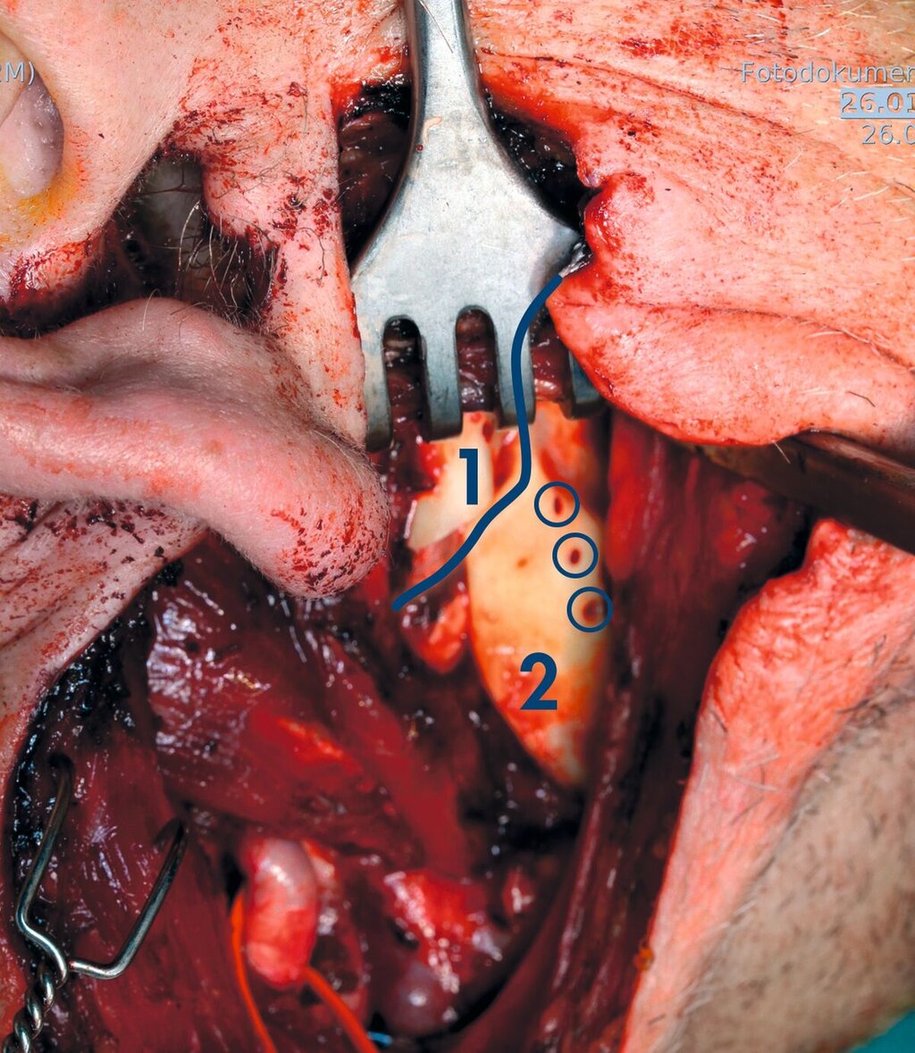 Nach subperiostaler Präparation wurde die geplante Osteotomie oberhalb des Foramen mandibulae angezeichnet. Zur späteren Reposition wurden vorab Osteosyntheseplatten angepasst, Schraubenlöcher vorgebohrt und das Material wieder entfernt. Die Osteotomie erfolgte mittels Säge unter Schutz der medialen Weichteile. Nach Distraktion des Osteotomiespalts mit einem Stromeyer-Haken bestand freie Sicht auf den Tumor.
