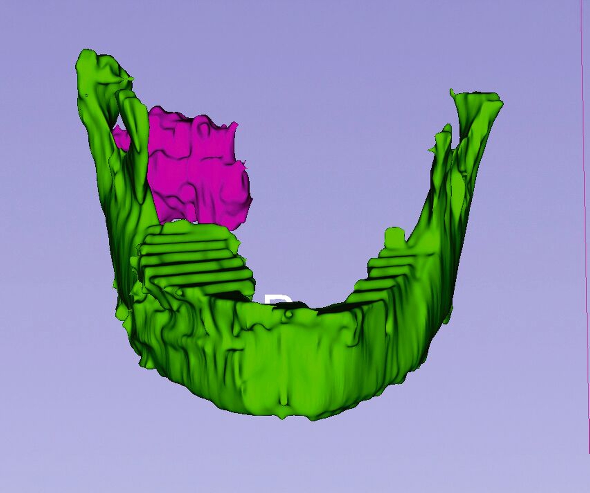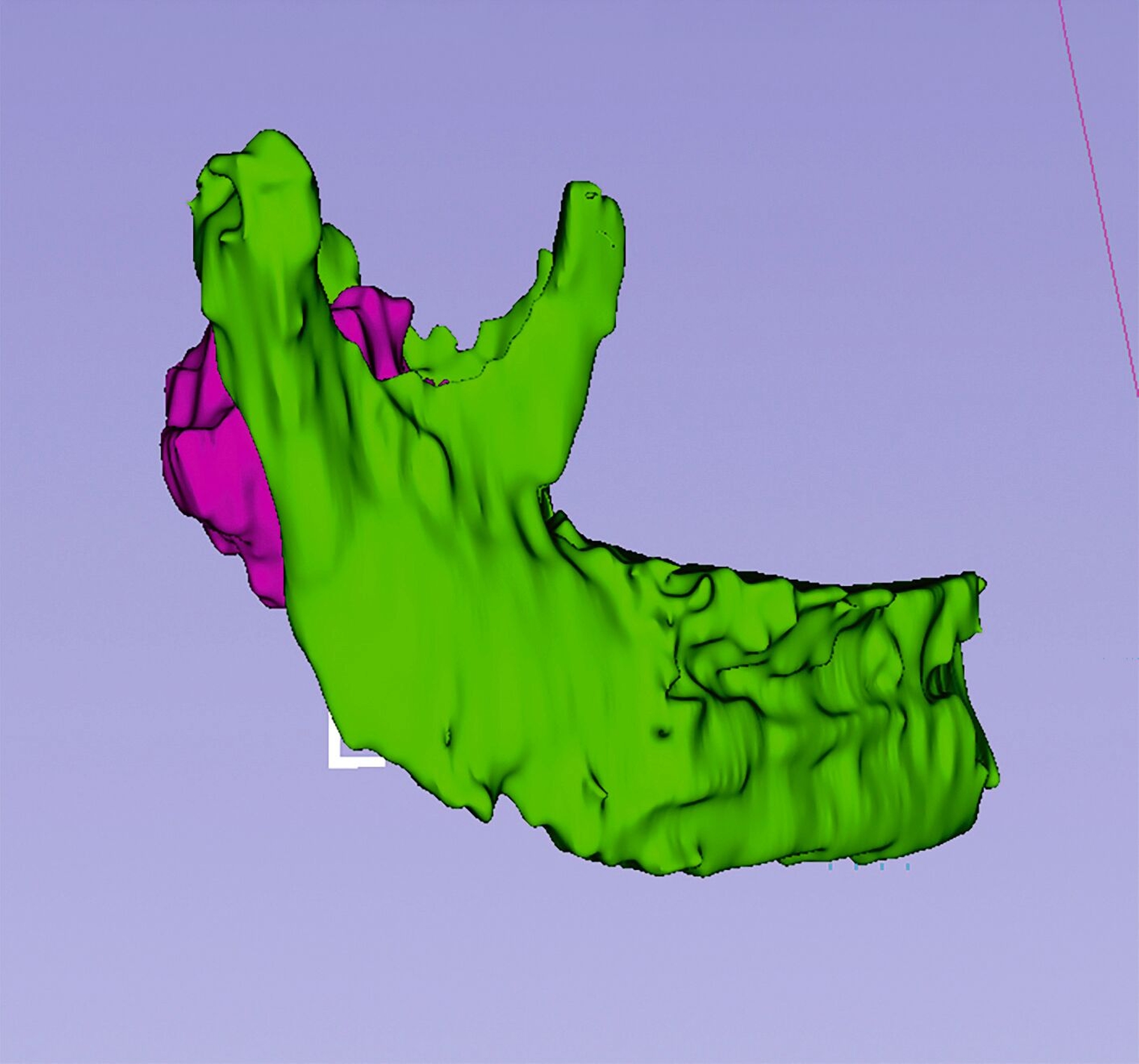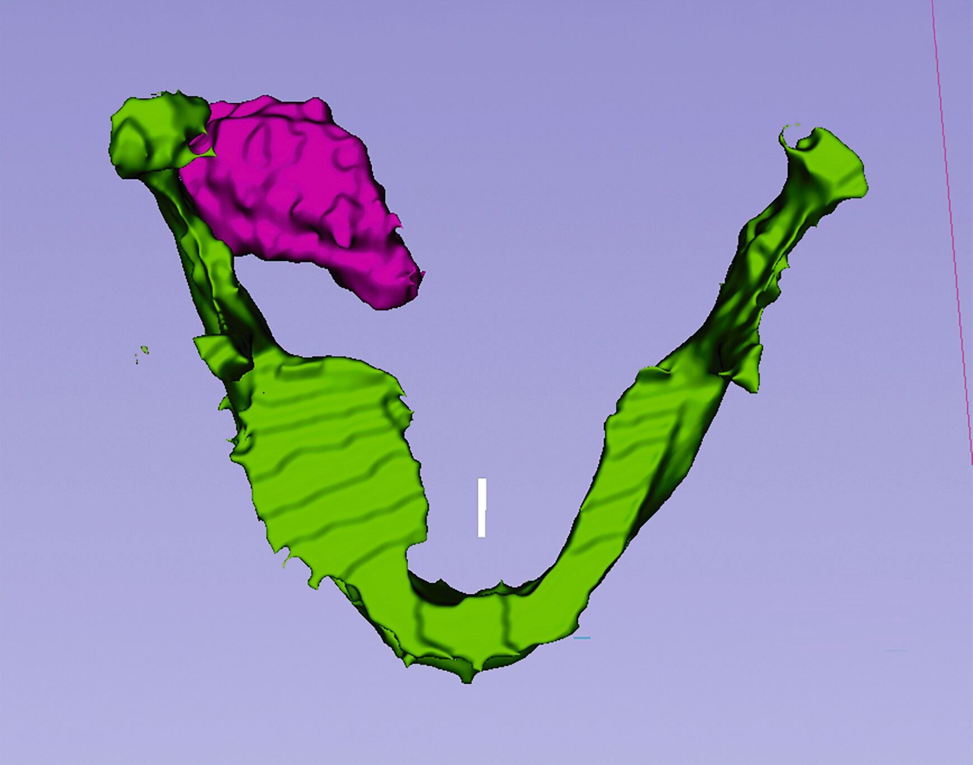 Zur besseren räumlichen Einschätzung wurde das MRT-Datenset mittels der Open-Source-Software 3D Slicer segmentiert [Fedorov et al., 2012]. Mithilfe der Funktion „Grow from seeds“ erfolgte eine separate Segmentierung des Unterkiefers und der Raumforderung, ergänzt durch manuelle Korrekturen.