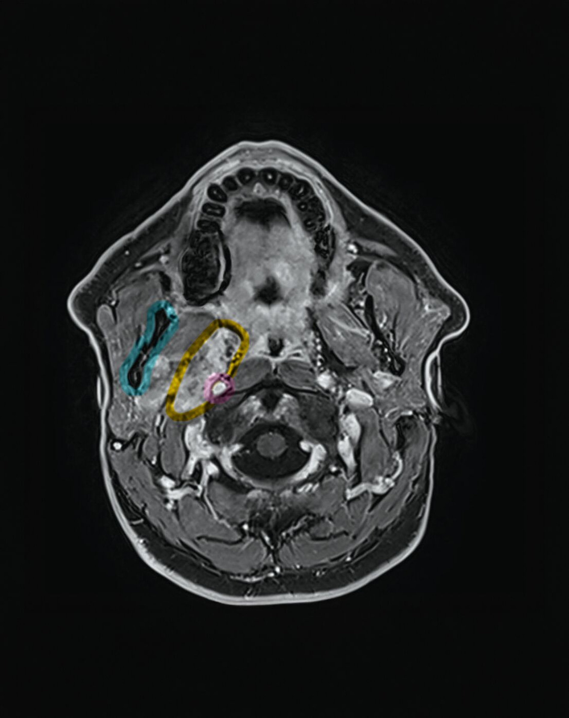 Ein vaskulärer Ursprung konnte mittels dynamischer Sequenzen ausgeschlossen werden. Die Raumforderung wuchs verdrängend bis an den Musculus pterygoideus heran und hatte einen langstreckigen Kontakt von > 90° zur A. carotis interna. Zusätzlich bestand eine schlitzförmige Kompression der V. jugularis interna sowie eine fokale Teilthrombosierung der V. facialis communis. Pathologisch vergrößerte Lymphknoten waren nicht nachweisbar.