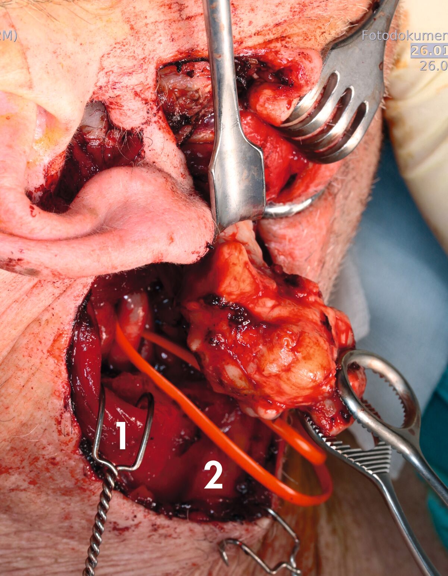 Präoperativ erfolgten die Anlage eines arteriellen Katheters, das Bereithalten von Erythrozytenkonzentraten sowie die Vorbereitung eines intraoperativen Nervenmonitorings. Nach präaurikulärem Hautschnitt mit kaudaler und anteriorer Erweiterung wurde das Platysma schichtweise präpariert. Der Hauptstamm des N. facialis wurde dargestellt und kontinuierlich überwacht.