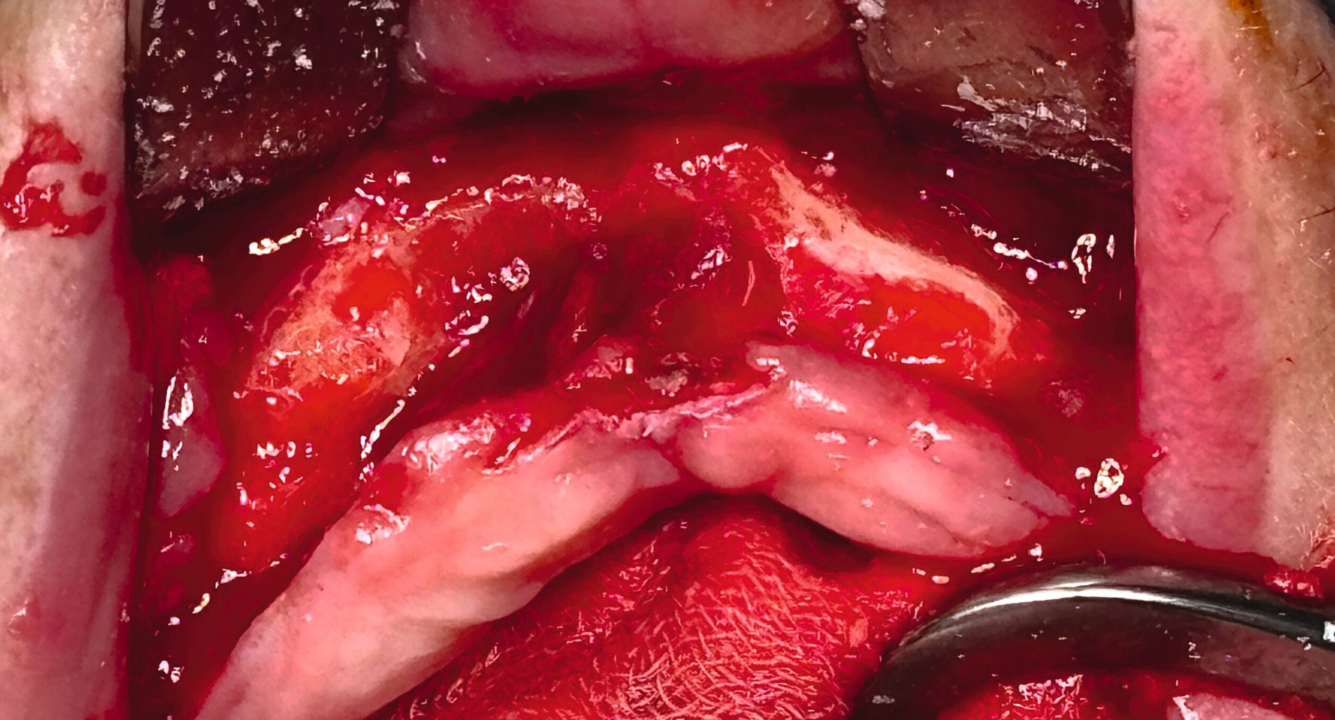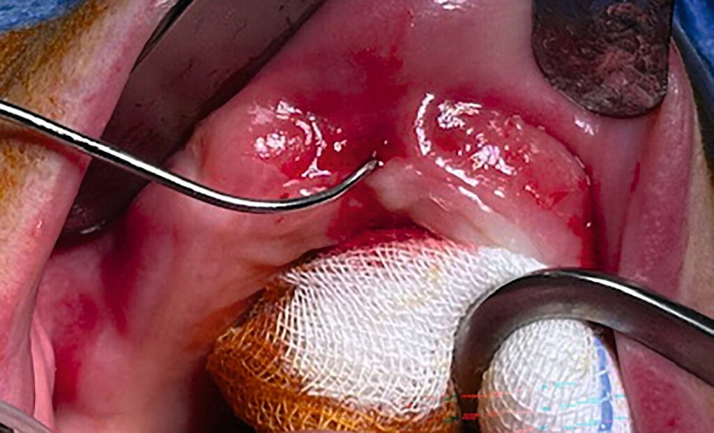 Mit der Identifikation der Entzündung im MRT war die Indikation zum Eingriff gegeben. Die Exploration des Areals zeigte eine feine Fistelformation sowie bereits intraoperativ erheblich entzündlich verändertes Weichgewebe in der Oberkieferfront (Abbildungen 7 und 8). Eine Dekortikation und eine plastische Defektdeckung wurden – gemäß den fachspezifischen Leitlinien – durchgeführt.