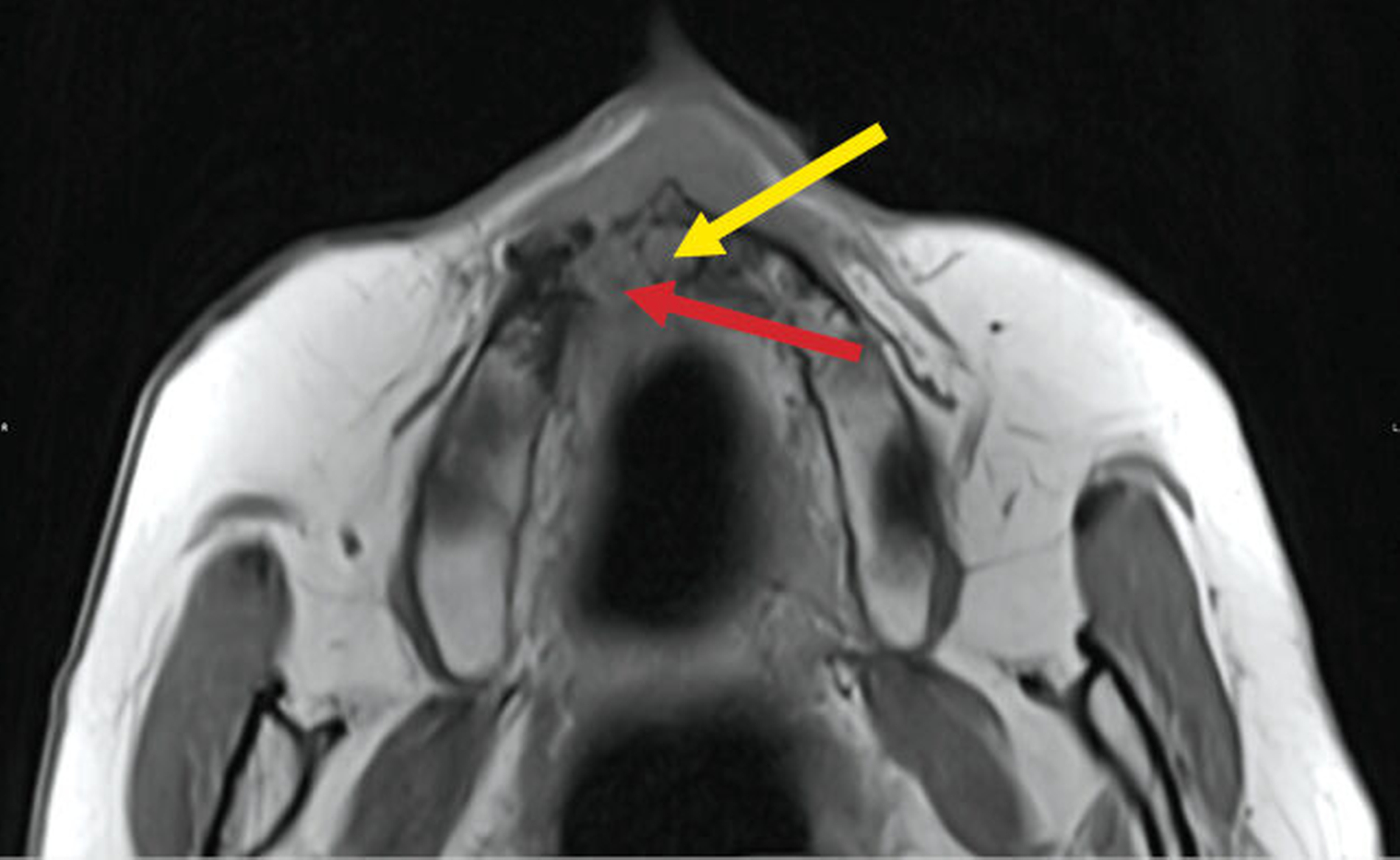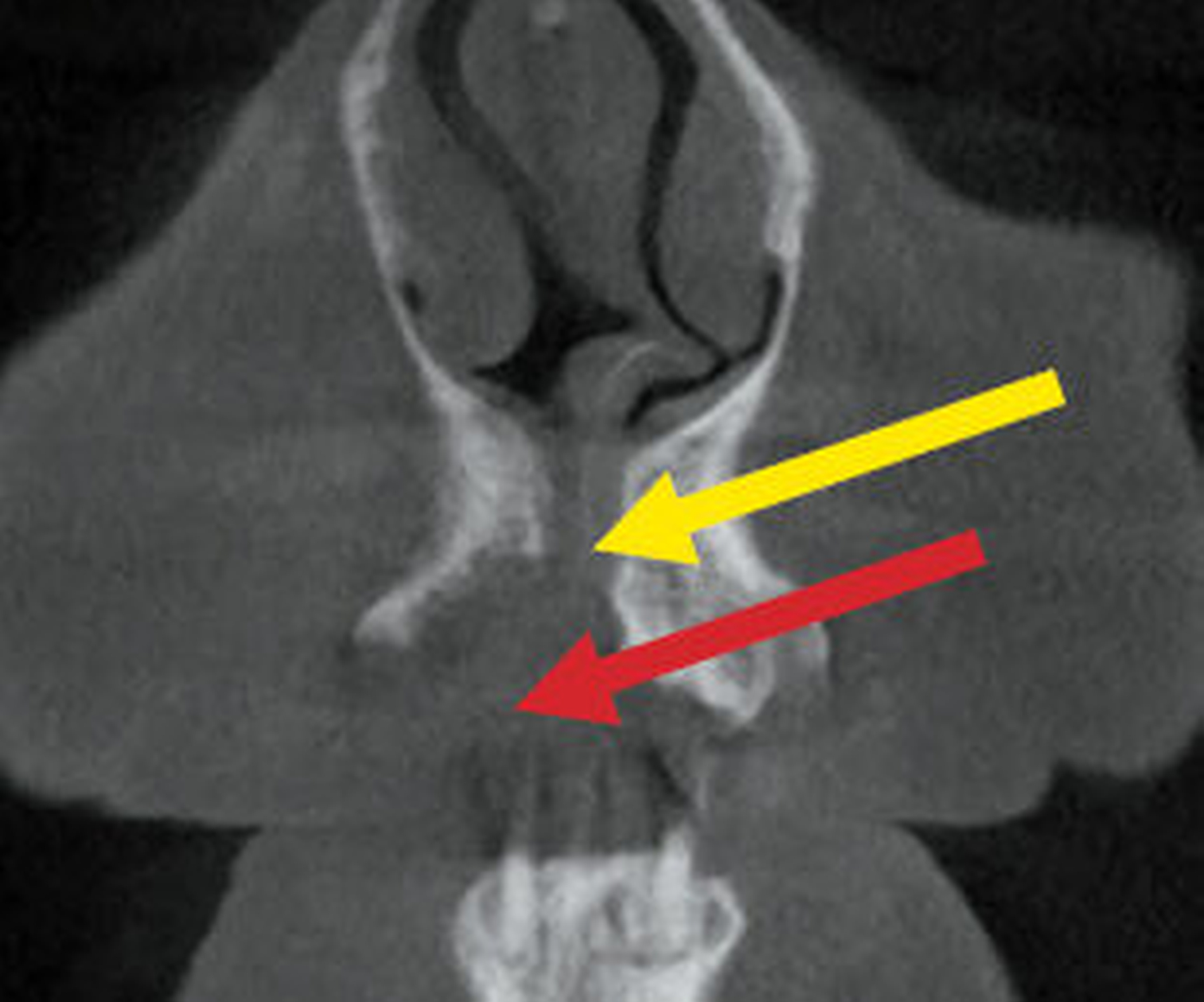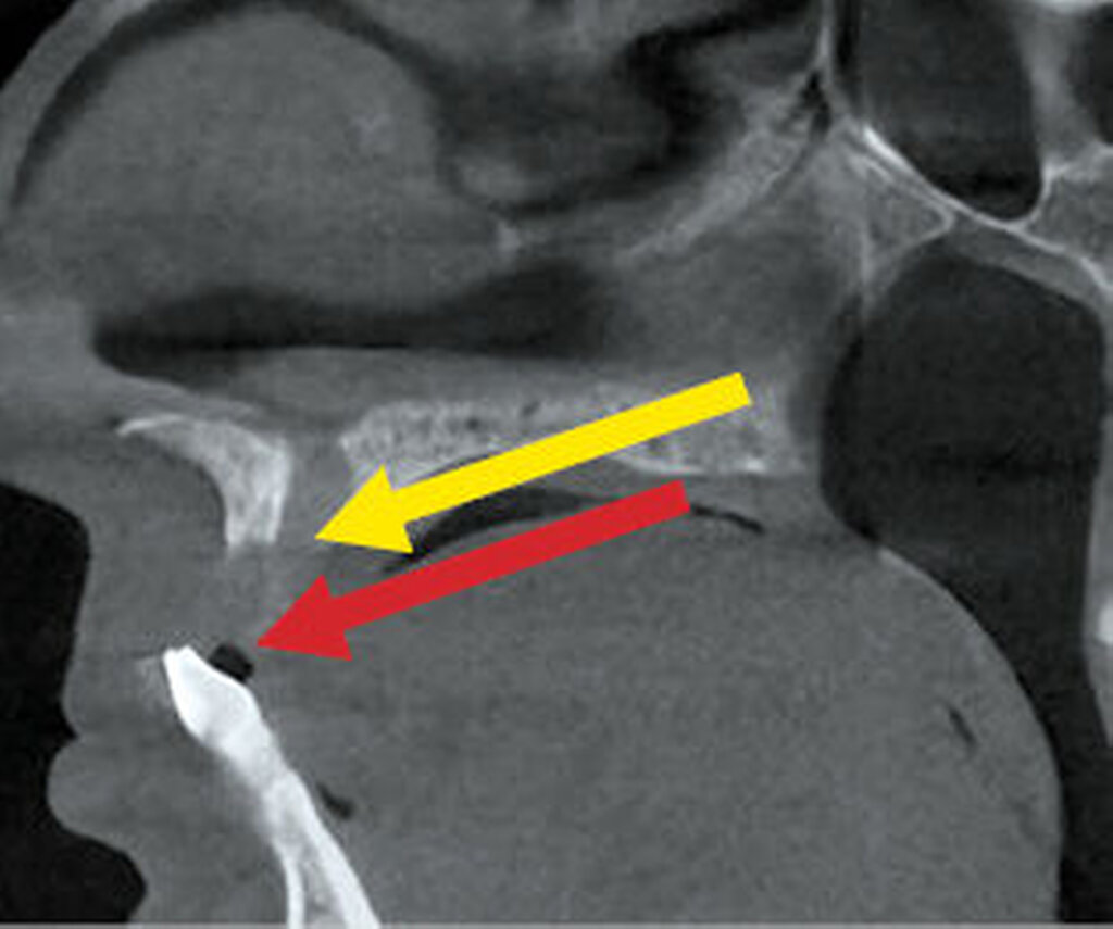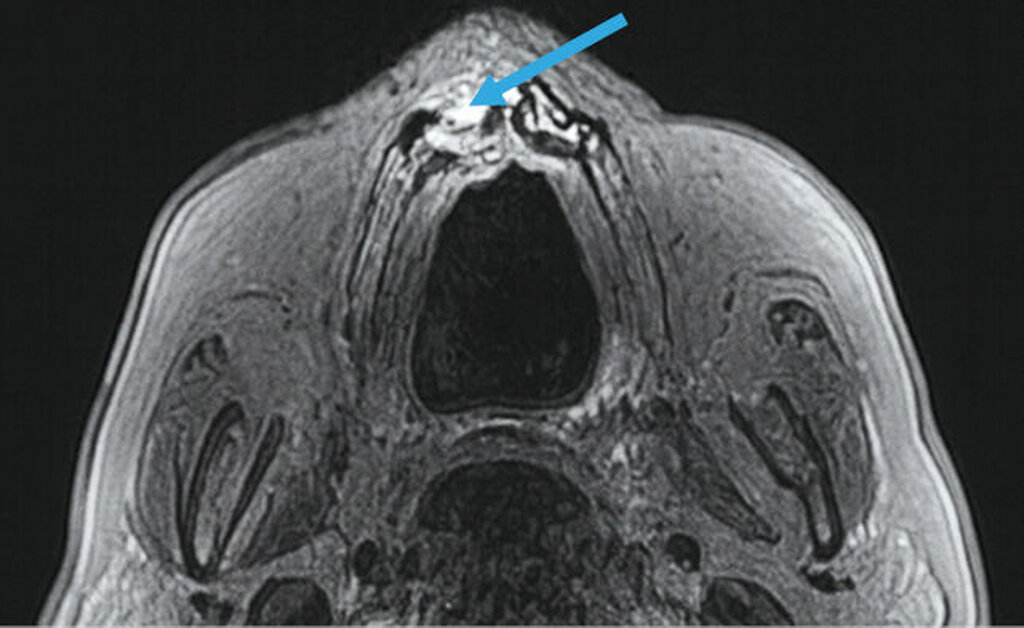 Nach einem symptomfreien Intervall von mehreren Jahren beklagte die Frau erneut latente und intermittierende Beschwerden im Oberkieferbereich. Zunächst stellte sie sich nach hauszahnärztlicher Überweisung bei einem niedergelassenen MKG-Chirurgen vor. Nach einer Schädel-MRT-Untersuchung bei einem niedergelassenen Radiologen, die keine spezifische Pathologie ergab, erfolgte die Weiterleitung an eine externe Universitätsklinik. Da weder die klinische Untersuchung noch die bisherige radiologische Bildgebung richtungsweisende Befunde liefern konnten, wurde eine operative Intervention dort nicht in Betracht gezogen. Die Patientin wandte sich daraufhin an unser Haus.