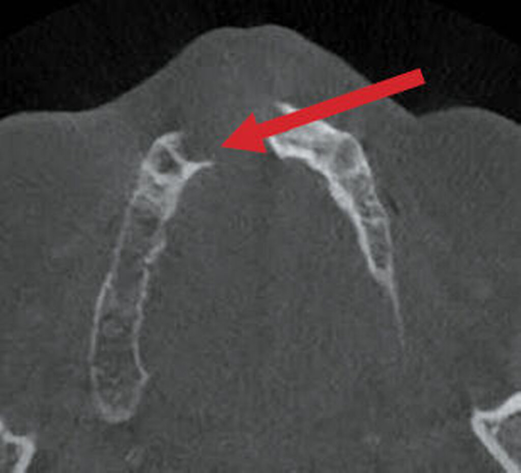 Im DVT sind in allen Raumebenen deutliche Knochendefekte zu erkennen, die zur Unterbrechung des Alveolarfortsatzes in der OK-Frontzahnregion führen. Zusätzlich grenzt sich ein breiter Canalis incisivus ab (Abbildungen 2 bis 4). Ein Rückschluss auf Pathologien im bezeichneten Bereich lässt sich aus den vorliegenden radiologischen Unterlagen nicht ziehen.