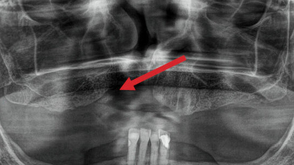In diesem Patientenfall geht es um eine 65-jährige Patientin, die infolge einer Bisphosphonat-Applikation fünf Jahre zuvor bereits eine Dekortikation und plastische Defektdeckung im anterioren Oberkiefer erfahren hatte. Der resultierende keilförmige Defekt ist auf der Panoramaschichtaufnahme deutlich zu erkennen (Abbildung 1).
