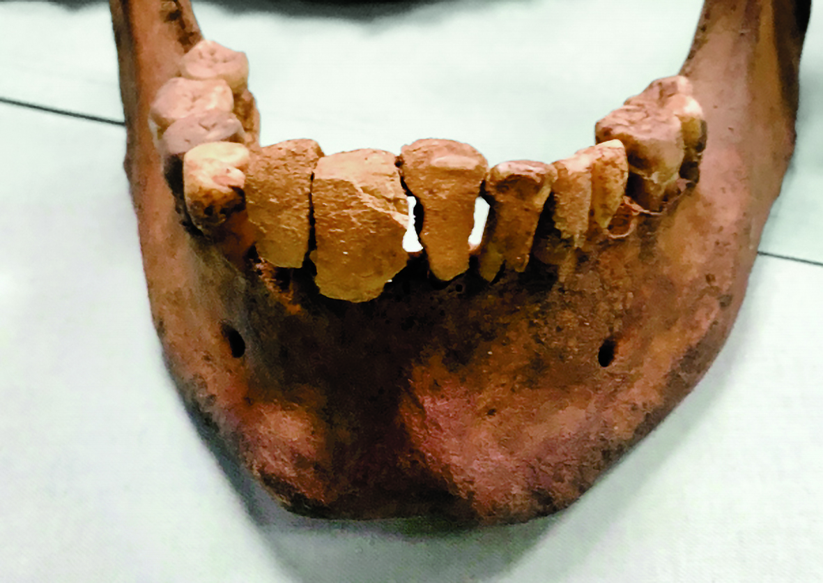 Besonders auffällig ist der massive Ansatz von Zahnstein im Bereich der Unterkieferfront. Die Unterkieferfrontzähne sind von einer 1–2 Millimeter dicken Schicht Zahnstein regelrecht überzogen, die zu Lebzeiten wohl „verblockt“ gewesen sind (Abbildung 1). Karies hingegen findet sich lediglich an einem Zahn – an Zahn 48. Das ist insofern bemerkenswert, als dass sich, betrachtet man die Molaren im Unterkiefer, keine Prädilektionsstelle in Form von bukkalen Fissuren oder Grübchen findet. Wie es ausgerechnet zu einer Kariesbildung an dieser Stelle gekommen ist, ist daher noch zu klären.