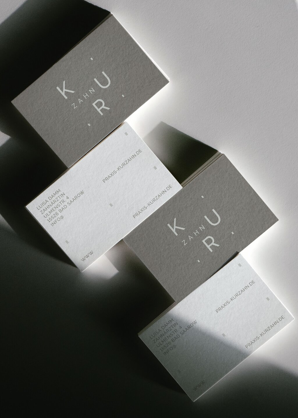 Die Entscheidung fiel Damm nicht leicht – schließlich soll das Design zeitlos sein und zu ihr und ihrer Praxis passen. Das Rennen machte schließlich KURZAHN. Die Anspielung auf den Standort in den KURpark Kolonnaden in Verbindung mit der Fachdisziplin ZAHNmedizin ist das, was Patientinnen und Patienten sofort wahrnehmen sollen. Klarer Bonus: Das Naming ist einprägsam und einzigartig – die besten Voraussetzungen für eine erfolgreiche Marke.