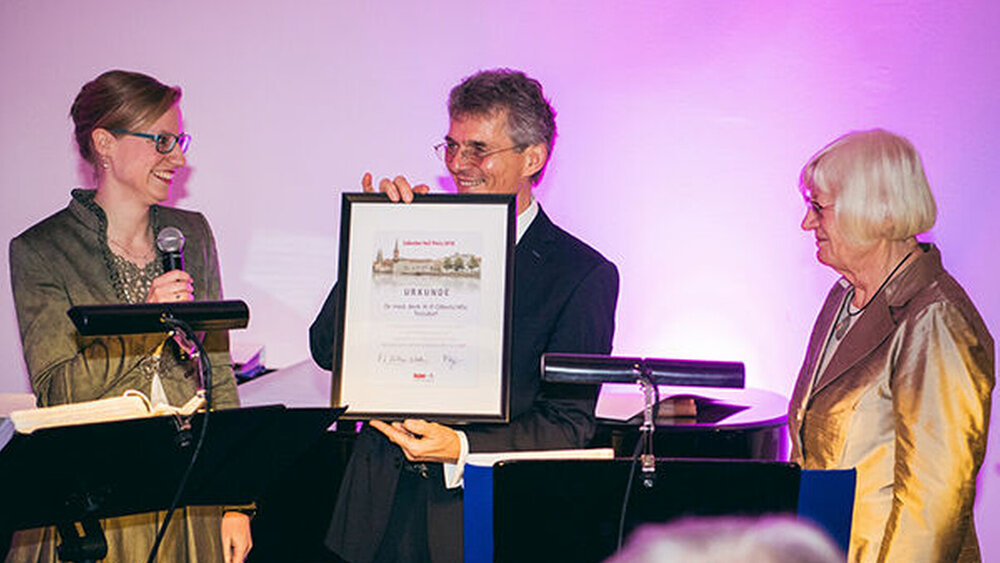 Im Anschluss an den Workshop trafen sich die Teilnehmer zur Abendveranstaltung im Europäischen Hansemuseum, wo auch der mit 10.000 Euro dotierte Lübecker hoT-Preis 2018 verliehen wurde. Preisträger war Dr. Heinz-Peter Olbertz, der für sein Engagement und seine Ursachenforschung im Bereich der Parodontitis ausgezeichnet wurde. Wiebke Volkmann überreichte dem sichtlich überraschten Preisträger die Urkunde. Er kündigte an, seine Forschungstätigkeit im Sinne einer ganzheitlichen Gesundheitsversorgung seiner Patienten weiter voranzutreiben.