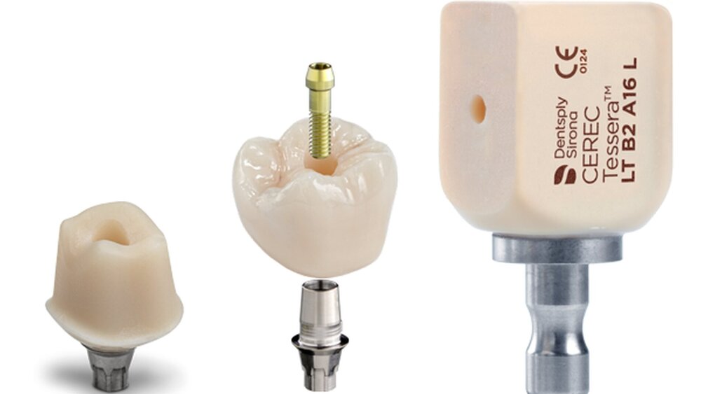 CEREC Tessera Abutment Blöcke sind hochfeste CAD/CAM-Blöcke (>700Mpa biaxiale Biegefestigkeit) aus weiterentwickeltem Lithium-Disilikat, zur Herstellung von hochästhetischen, implantatgetragenen Einzelzahnversorgungen in einem effizienten Verarbeitungsprozess (Glasurbrand in 4:30 Minuten im vorgeheizten CEREC SpeedFire). Aufgrund des vorgefertigten Schraubkanals lassen sich sowohl Hybrid-Abutments mit separater Krone als auch monolithische Hybrid-Abutment-Kronen effizient für das Verkleben mit vorgefertigten TiBase-Strukturen herstellen.
