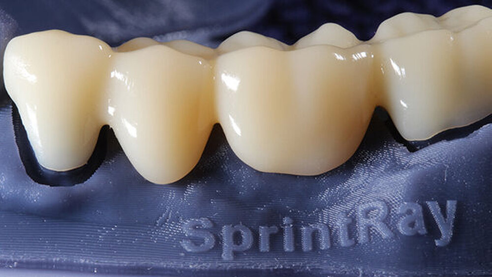 Kronen und Veneers zur definitiven Versorgung und Okklusionsschienen, Bohrschablonen, Prothesen, Meistermodelle und Modelle für die kieferorthopädische Alignertherapie sowie Matrizen für die indirekte Klebetechnik. Im Bereich der Kronen zeigen sich unsere Erstanwender begeistert, die perfekte Passung wird gelobt, genauso wie die Okklusion und der Randschluss, selbst bei einer testweise gedruckten Brücke (siehe Abbildung).