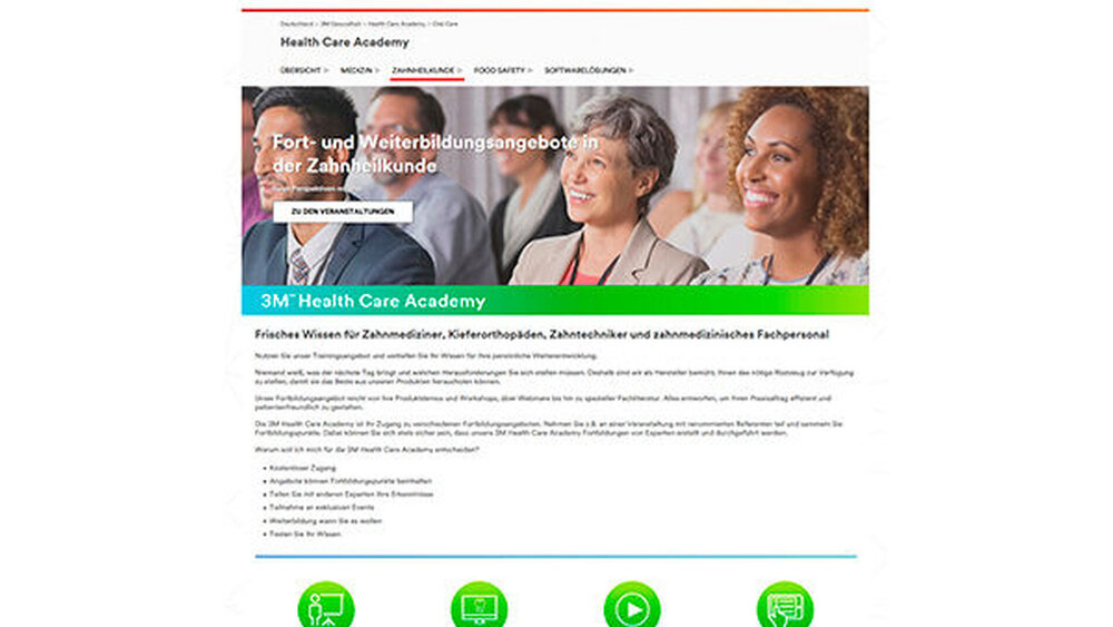 Wer sein Fachwissen erweitern möchte oder auch einfach nur auf der Suche ist nach konkreten Anwendungstipps, ist auf der Webseite der 3M Health Care Academy goldrichtig. Besucher erhalten eine bündige Übersicht über anstehende Events sowie Zugang zu Videos, Fachliteratur u.v.m.