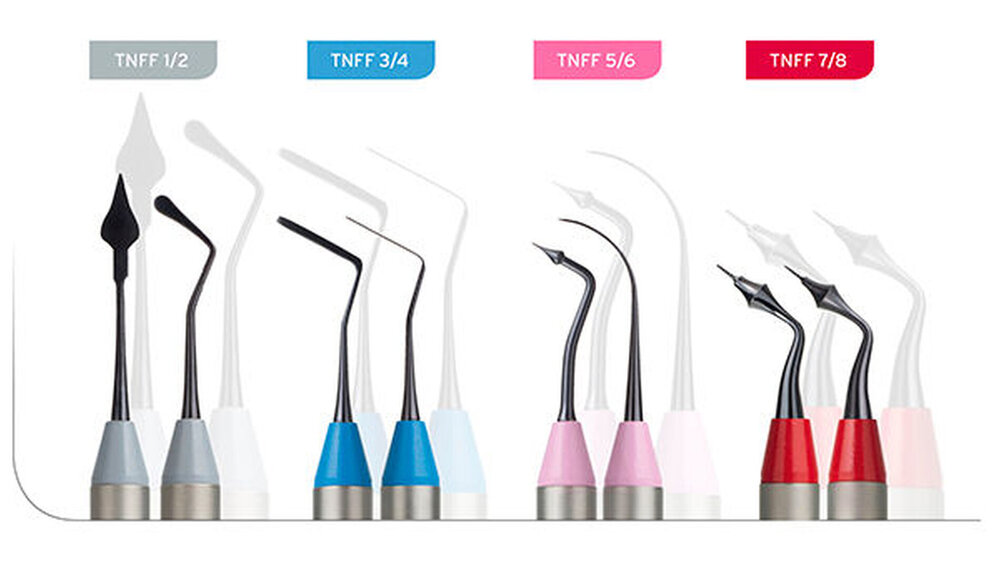 resultiert. Diese sorgt für einen hervorragenden Kontrast gegenüber den weißen Kompositmaterialien, der Zahnhartsubstanz sowie zur Gingiva. Die Beschichtung erzeugt eine höchst glatte Oberfläche und widersteht der Anhaftung von klebrigen Kompositmaterialien. Der glatte Handgriff ist ergonomisch und leicht. Jedes Instrument hat darüber hinaus ein eigenes Set aus farbigen Koni, um die Instrumentenidentifizierung zu vereinfachen. Neben den vier Instrumenten besteht das Set aus einer IMS-Kassette, die die Instrumente vor Beschädigungen beim Transport und während des Sterilisationsprozesses schützt.