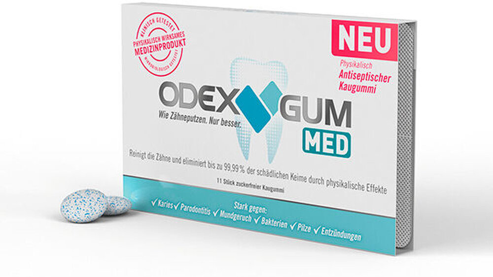 ODEX GUM MED ist eine einzigartige Kombination aus Zahnbürste, Zahnpasta und antibakteriellem Mundwasser – und lässt sich als Kaugummi ganz einfach anwenden – jederzeit und überall. Mit seiner innovativen und einzigartigen Formel eliminiert ODEX GUM MED durch physikalische Effekte nachweislich bis zu 99,99 Prozent schädlicher Keime und Krankheitserreger – selbst an Stellen, die mit der Zahnbürste nur schwer zu erreichen sind. ODEX GUM MED ist dadurch ein wichtiger Baustein zur Vorbeugung von Karies, Parodontitis, Halitosis (Mundgeruch) und anderen entzündlichen Veränderungen der Mundhöhle.