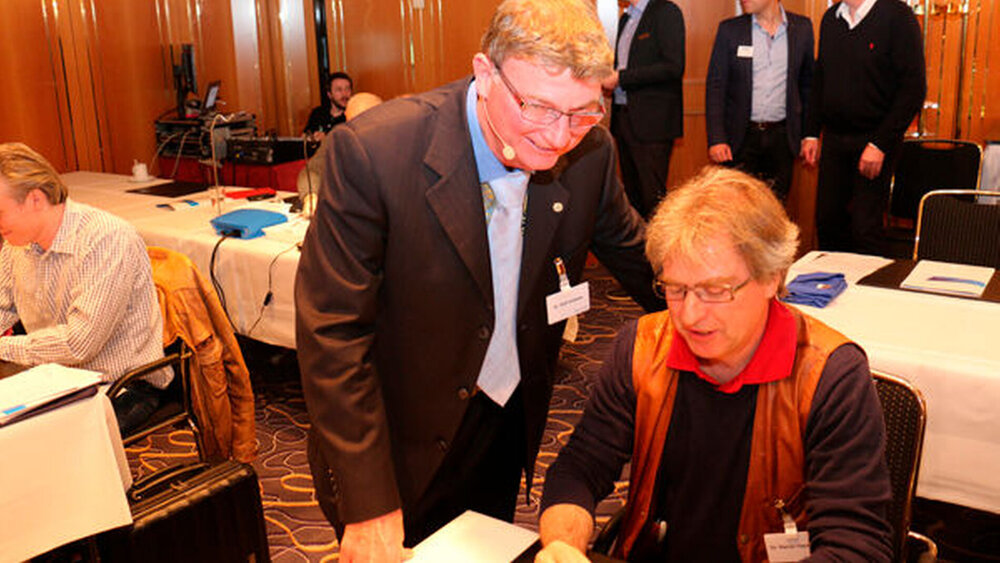Dr. Rolf Vollmer demonstrierte den Teilnehmern des vierten Workshops, wie man nach dem RevitaliZe-Konzept eine Komplettversorgung des unbezahnten Kiefers vornimmt. Am Kunststoffmodell erklärte Vollmer, wie man mit dem Chirurgie Kit arbeitet, wie das Implantat inseriert wird (4 Tapered Screw-Vent). Außerdem inserierte die Gruppe weitere Implantate, um eine festsitzende Brücke zu fixieren.