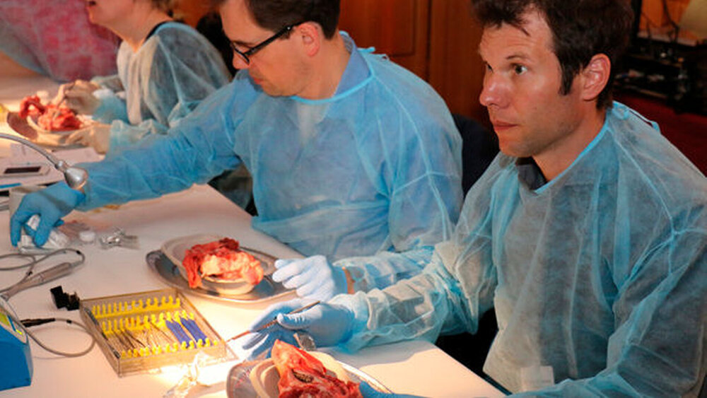 Ebenfalls am Schweinekifer zeigte Dr. Daniel Engler-Hamm, was beim Hart- und Weichgewebe-Management rund um Implantate zu beachten ist. Zu den Übungen gehörten die mukogingivale Augmentation, knöcherne Augmentation an einem Implantat mit Knochenverlust und die Explantation eines Implantats.