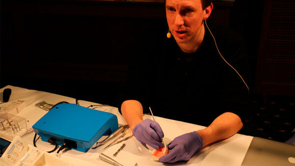 Im Theorie-Teil erläuterten Güth und Schweiger die digitale Planung, das operative Vorgehen sowie das prothetische Vorgehen aus wissenschaftlicher und praktischer Sicht. Im Anschluss demonstrierten die Referenten die Instertion des Implantat in einen Kunststoffkiefer und die Befestigung des Matchholders (Scanbody) auf dem Modell. Die Teilnehmer hatten dann die Möglichkeit, den Scan mittels Intraoralscanner selbst durchzuführen. In einem dritten Schritt zeigten die Referenten die labortechnische Herstellung der Kronen an einem vorgefertigten Gipsmodell.
