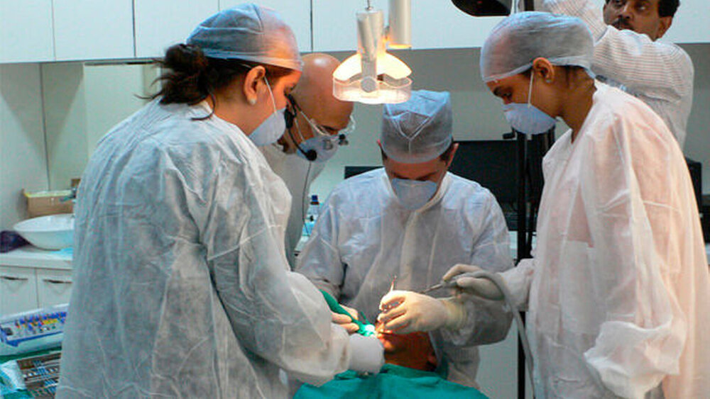 Vikram Vaidya, Geschäftsführer SP Dental, nutzte die Gelegenheit einen erfahrenen Oralchirurgen und Zahntechniker aus Europa im Land zu haben und organisierte vier weitere Workshops. Einer davon fand an der DY Patil University School of Dentistry in Navi Mumbai im Rahmen des Integriteeth Kontinuums statt. Integriteeth fördert junge Zahnärzte durch den Austausch von Ideen, Wissen und der Vorstellung neuester Technologien durch Gastreferenten, die ein- oder zweitägige Kurse an der Universität halten. Bei den Vorbereitungsgesprächen der Workshops kam das Gespräch auf einen Patienten der Universität, der trotz neuer Totalprothese im Unterkiefer nicht vernünftig essen könne. Der betroffene Patient kann sich aufgrund seiner finanziellen Lage, eine andere jedoch Versorgung nicht leisten. Dr. Burzin Kahn machte zusammen mit Dr. Obadan das Angebot, den Patienten im Workshop zu implantieren und mit seinem Zahntechniker Danesh und dem deutschen Zahntechniker Jörg Lermer, entsprechend der Sky fast & fixed Therapie von bredent medical, diesen sofort mit einer festen temporären Brücke zu versorgen. Die Planung fand am Vortag in der Praxis von Dr. Burzin Kahn statt, wo das Vorgehen anhand der bisherigen Versorgung mit den Zahnärzten und Zahntechnikern diskutiert wurde. Die OP wurde in den Vortragsraum übertragen, wo sie von Professoren und 70 Postgraduierten verfolgt wurde. Dr. Obadan und Dr. Kahn führten die OP routiniert durch und das Zahntechnikerteam konnte, trotz eines Stromausfalls, die temporäre Brücke herstellen, so dass der Patient vier Stunden nach der OP mit einem ehrlich strahlenden Lächeln auf dem abschließenden Gruppenbild zu sehen war. Der Patient wurde am nächsten Morgen nochmals einbestellt und dem Auditorium vorgestellt. Er zeigte sich ohne Schwellungen und sprach völlig normal. Er berichtete, dass er bereits am Abend essen konnte und die leichten Schmerzen nach Einnahme der mitgegebenen Medikamente sofort vergangen waren.