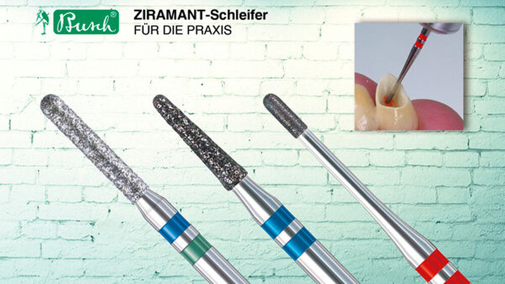 Hier bietet BUSCH aus seinem Diamantschleifer-Programm die neue Ziramant-Schleifer Serie für die Zahnarztpraxis an. Diese verfügt über drei auf Zirkonoxid und verschiedene Arbeitsschritte abgestimmte spezielle und vor allem stabile Mischkorndiamantierungen. Von der Korrektur von Abutmants, über die Trepanation von Restaurationen bis hin zur Entfernung von Restaurationen finden Sie die entsprechenden Ausführungen in unserem Angebot.