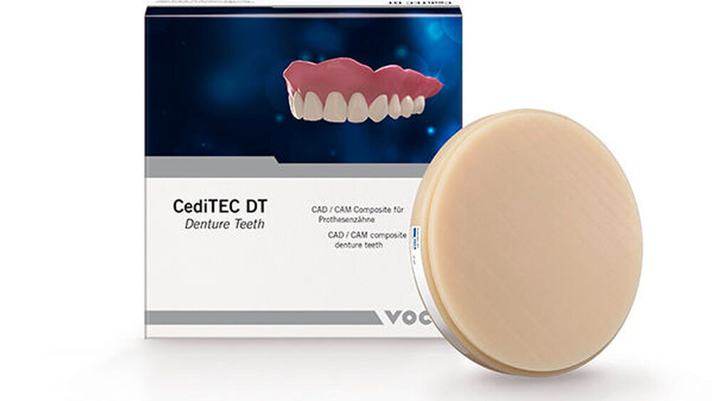 Von Protheseneinzelzähnen über Zahnsegmente bis zum kompletten Zahnkranz für die herausnehmbare Prothetik: Mit CediTEC DT lassen sich mittels CAD / CAM-Fräsverfahren schnell und sehr präzise individuelle Prothesenzähne erstellen. Die vier Farben A1, A2, A3 und BL, die weitere Möglichkeit zur farblichen Anpassung sowie die transluzente Farbgebung sorgen für eine hohe Ästhetik. Das innovative Material lässt sich mühelos polieren – für einen natürlichen Glanz. Das bereits ausgehärtete Composite wird in der Disc-Form angeboten, die mit ihrem Durchmesser von 98 mm und einer Höhe von 20 mm in alle universellen Disc-Halterungen von marktüblichen Fräsgeräten passt.