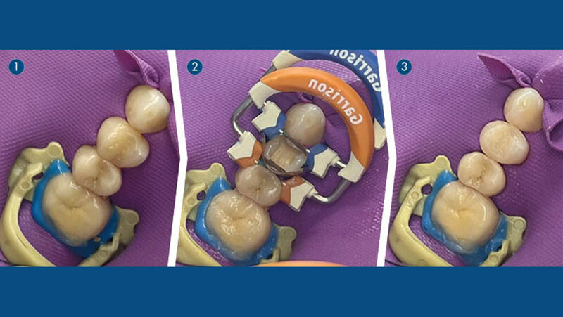 Nach Entfernung der alten Mehrschichtfüllung und Präparation der Kavität wurde diese gereinigt und desinfiziert. Eine Matrize mit Keil sorgte für die Formgebung. An Zahn 24 distal wurde aufgrund einer tiefgehenden Sekundärkaries Kerr Life Fast (Cp) aufgetragen. Zur Vorbereitung der Kavität wurde der Schmelz mit OmniEtch 35 Prozent geätzt. Die Restauration erfolgte in Mehrschichttechnik mit G-Premio Bond und Tetric Evo Ceram. Dank HySolate Flexidam blieb das Arbeitsfeld während der gesamten Behandlung trocken und gut sichtbar. Der Kofferdam schützte die Patientin zudem vor dem Verschlucken von Fremdkörpern und verhinderte den Kontakt des Weichgewebes mit Instrumenten. Eine abschließende Politur und Okklusionsüberprüfung rundeten die Behandlung ab. (Abbildung 2: Zahn 24 während der Behandlung)