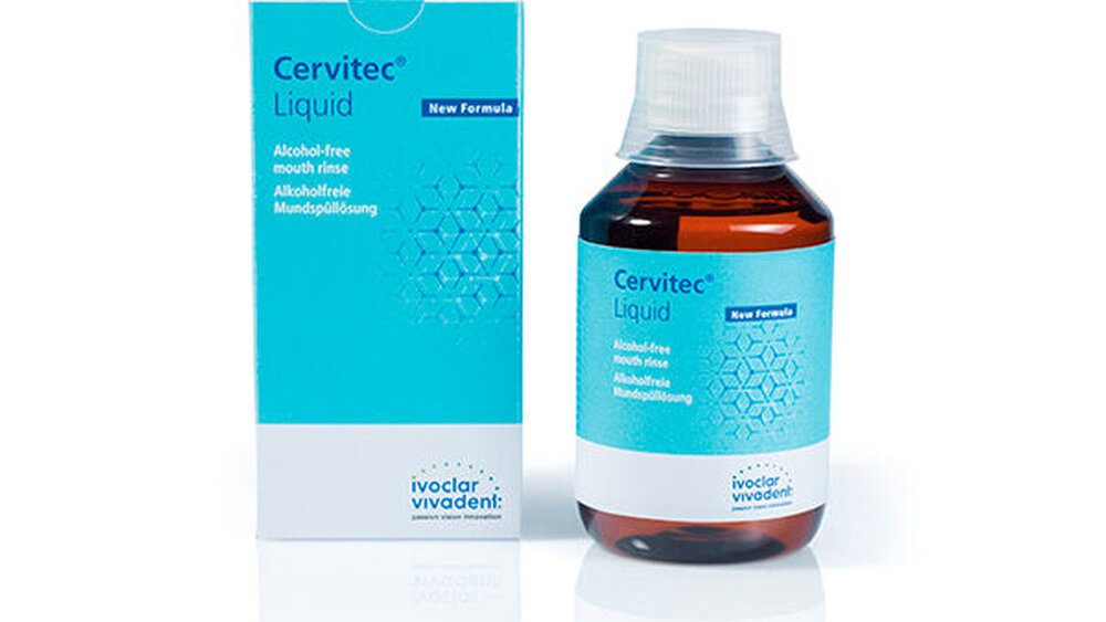 Die neue Pflegeformel von Cervitec Liquid enthält Xylit, Provitamin D-Panthenol plus 0,1% Chlorhexidin. Cervitec Liquid ist sanft zu strapaziertem Zahnfleisch, periimplantärem Gewebe und Schleimhaut.