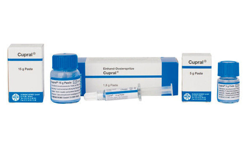 Mit Cupral werden alle Keime – auch Anaerobier und Pilze – sicher mit Langzeitwirkung abgetötet. Daher ist das Präparat als Breitbandtherapeutikum ohne Resistenzbildung in der Parodontologie vielfach bewährt. In der Praxis sind verschiedene unkomplizierte Anwendungsmöglichkeiten langjährig erprobt. Sie erhalten Cupral im Fläschchen mit 5 g (Probierpackung) und 15 g, sowie in der praktischen 1,8 g-Einhand-Dosierspritze zur direkten Tascheneinbringung.