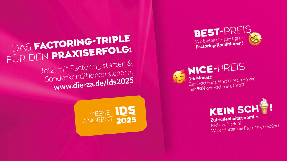 Fachkräftemangel und Liquiditätsengpässe sind nur zwei gute Gründe, die Abrechnung auszulagern – Factoring hilft, finanzielle Engpässe zu vermeiden und Praxen zu entlasten. Mit der Bestpreis-Garantie sichern sich Praxen die günstigste Factoringgebühr, während die Zufriedenheitsgarantie bei Unzufriedenheit nach sechs Monaten die Gebühr der ersten drei Monate erstattet. Die neue Nice-Preis-Garantie bietet zusätzlich 50 Prozent Rabatt auf die Factoringgebühr in den ersten Monaten – auf wie viele, entscheidet ein Dreh des Glücksrads am ZA-Messestand: Mindestens ein und maximal sechs Monate sind möglich. Wer nicht vor Ort ist, kann das Angebot auch online im März und April 2025 nutzen.