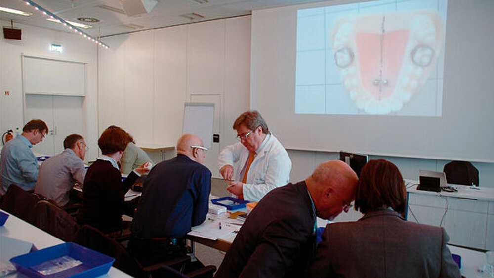 Am Nachmittag hatten die Teilnehmer die Möglichkeit, selbst den einfachen Umgang mit amda kennenzulernen. An Typodonten wurden unter Anleitung des Referenten die Schritte von der Insertion des tomas-pins über die Anpassung von amda bis zur Aktivierung zu Beginn und im Laufe der Behandlung geübt.