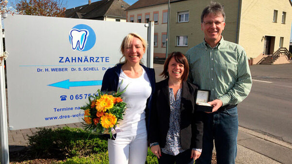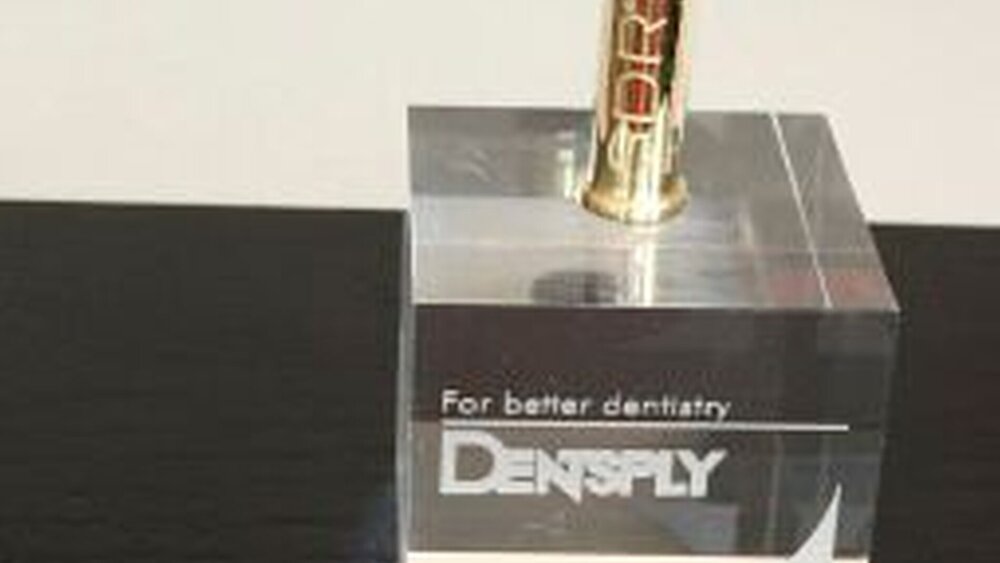 Dr. Heinz Weber gehört der Zahnarztpraxis Dres. Weber, Schell und Peters in Binsfeld an und ist bereits ein überzeugter SDR-Verwender. Sein Fazit: „SDR bietet eine sichere, schnelle und einfache Randgestaltung in schwer zugänglichen approximalen Kavitäten“. Aus den Händen von DENTSPLY Mitarbeiterin Nicole Schrodt erhielt Dr. Weber nun die goldene SDR-Compula – ein Unikat in Originalgröße, entstanden in hochwertiger, meisterlicher Handarbeit mit umlaufender Handgravur. Die SDR-Compula aus 14 Karat massivem Gold steht auf einem Acrylsockel und wird in einer Edelholzschatulle aufbewahrt.