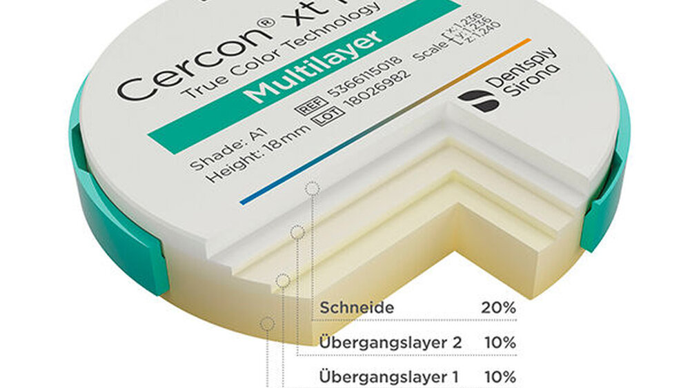 Dentsply Sirona erweitert sein Angebot an Zirkonoxidrohlingen jetzt um eine Ronde mit innerem Farbverlauf: Cercon xt Multilayer, kurz: Cercon xt ML.