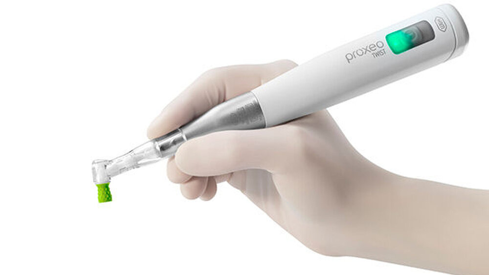 In der aktuellen zahnmedizinischen Behandlung ist die professionelle mechanische Entfernung von Belägen und Biofilm fester Bestandteil des Prophylaxeworkflows und der Parodontitistherapie. Rotierende polierende Instrumente, wie das neue kabellose Proxeo Twist Poliersystem, entfernen mit den passenden Prophy-Einwegwinkelstücken Plaque und Verfärbungen gemäß den Empfehlungen der EFP (Consensus Report der European Federation for Periodontology [1]). Laut dieser Empfehlungen kann die professionelle mechanische Plaque Entfernung (PMPR) von weichen und harten Belägen und Verfärbungen der Entstehung von Gingivitis, Mukositis und die darauffolgende Parodontitis oder Periimplantitis in hohem Maße vorbeugen.