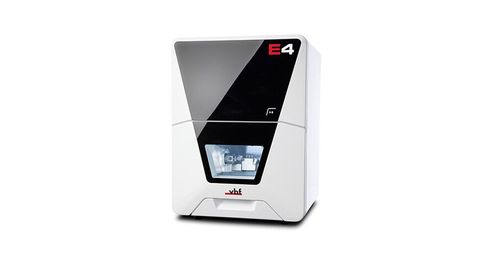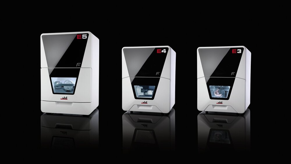 Im Einzelnen betrachtet, ist die E5 eine innovative Trockenfräsmaschine für Ronden, die dank ihrer fünf Achsen auch komplexe Indikationen mit höchster Präzision meistert. Die kompakte Nassschleifmaschine E4 hingegen verfügt über vier Achsen und wurde sowohl für die Nass- als auch Trockenbearbeitung von Blöcken entwickelt. Mit der E3 erschließt vhf erstmalig kieferorthopädische Anwendungen. Sie ist eine Fräsmaschine, die sich speziell für das Austrennen verschiedenster Formen von Tiefziehschienen wie Alignern, Aufbissschienen, Knirscherschienen und weiteren Varianten bis hin zum Sportmundschutz eignet.
