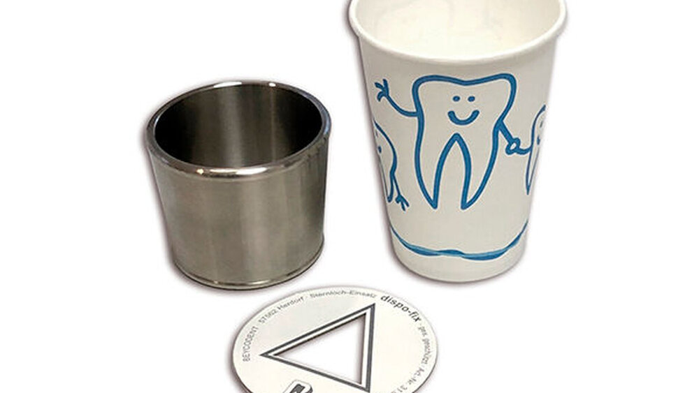 Mit Dispofix und Becherbeschwerungsring von BEYCODENT werden Einwegbecher zu praktischen Abfallbehältern.