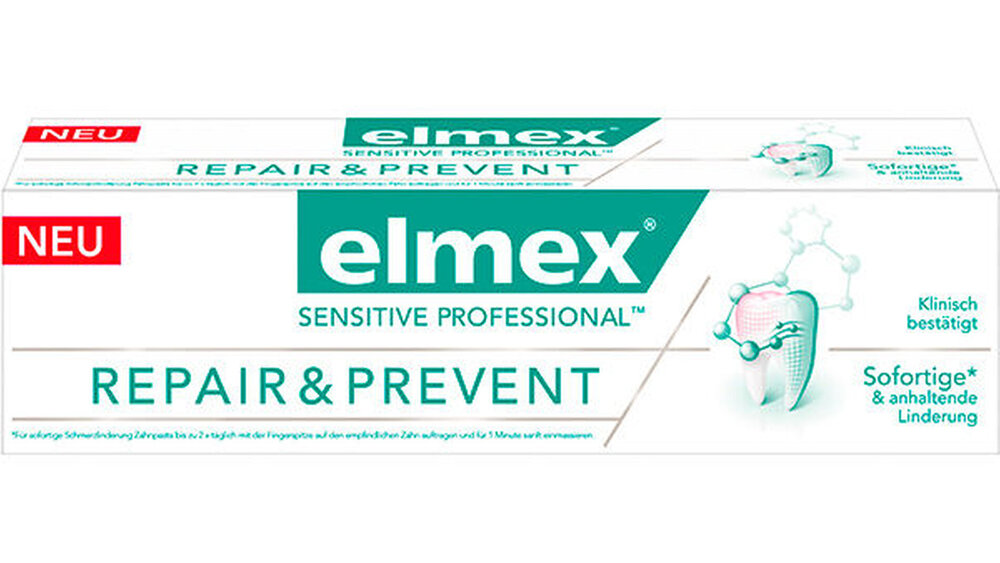 Mit der elmex SENSITIVE PROFESSIONAL REPAIR&PREVENT erweitert CP GABA sein Sortiment für schmerzempfindliche Zähne um eine Zahnpasta mit doppeltem Ansatz: sie lindert den Schmerz und beugt gleichzeitig künftiger Schmerzempfindlichkeit vor. Die überlegene PRO-ARGIN Technologie der Zahnpasta versiegelt und repariert die offenen Reizleiterkanälchen, die für die schmerzempfindlichen Zähne verantwortlich sind. Eine der Hauptursachen der Schmerzempfindlichkeit ist Zahnfleischrückgang, da hierdurch Zahnhälse und Dentintubuli freigelegt werden. Die neue elmex SENSITIVE PROFESSIONAL REPAIR&PREVENT enthält daher zusätzlich Zink, welches das Zahnfleisch stärkt und somit vor künftiger Schmerzempfindlichkeit schützt. Für die sofortige Schmerzlinderung kann die Zahnpasta mit der Fingerspitze auf den empfindlichen Zahn aufgetragen und für eine Minute leicht einmassiert werden. Zwei Mal täglich beim Zähne putzen angewendet, bewirkt die elmex SENSITIVE PROFESSIONAL REPAIR&PREVENT eine langanhaltende Linderung. Zahnfleischentzündung kann mit der neuen Zahnpasta nachweislich um bis zu 26 Prozent reduziert werden, Zahnstein um bis zu 22 Prozent.[1]