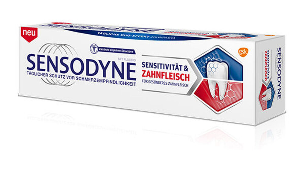 Die spezielle Zahnpasta Sensodyne Sensitivität & Zahnfleisch geht beide Probleme gleichzeitig an: Bei zweimal täglicher Anwendung wird die Schmerzempfindlichkeit klinisch nachgewiesen um 63 Prozent reduziert(3) und die Zahnfleischgesundheit um 40 Prozent verbessert(4) im Vergleich zu einer fluoridhaltigen Standardzahnpasta. Der Duo-Effekt basiert auf der Zinnfluorid-Formulierung der Zahnpasta. Der Inhaltsstoff bildet auf den schmerzempfindlichen Bereichen der Zähne bei zweimal täglicher Verwendung bereits ab der ersten Anwendung eine reparierende Schutzschicht. Schmerzhafte Reize werden so nicht an den Nerv weitergeleitet.(5,6)