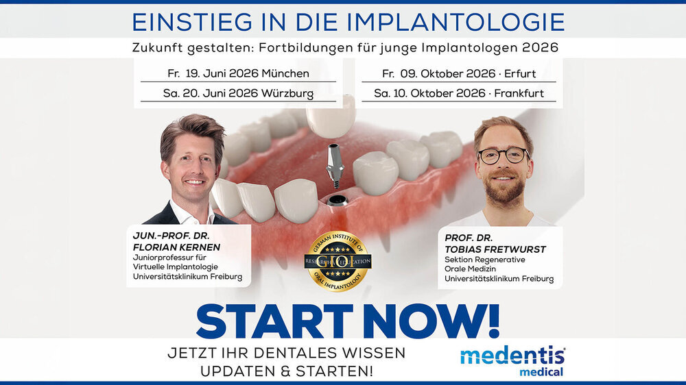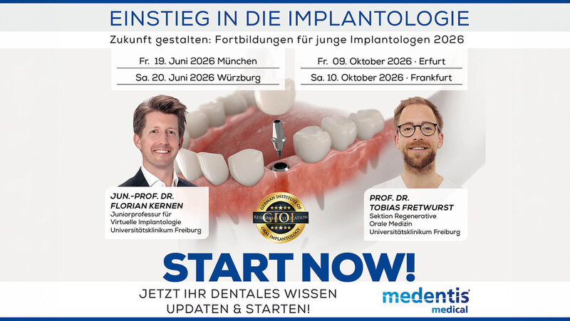 Unter dem Titel Einstieg in die Implantologie laden das Global Institute of Implantology (GIOI) und medentis für das Jahr 2026 zu einer strukturierten Fortbildungsreihe für junge Implantologinnen und Implantologen ein. Die Seminare richten sich an Zahnärztinnen und Zahnärzte, die neu in die Implantologie einsteigen oder bislang nur wenige Implantate inseriert haben. Veranstaltungsort und konkrete Termine werden im Fortbildungskalender des GIOI bekanntgegeben.