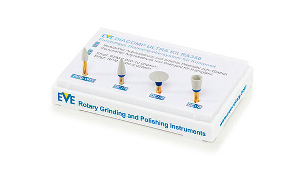 Weitere Vorteile sind: schnelle Resultate und minimierter Instrumentenwechsel/-bedarf. Die empfohlene Drehzahl liegt bei 3.000–10.000/min, autoklavierbar. Darüber hinaus minimiert EVE Diacomp Ultra die Oberflächenrauheit. Die Anwendung ist auf Nano-, Mikro-, Hybridkompositen, Kompomeren und Ionomeren möglich. Der Abtrag wird durch Drehzahl und Druck gesteuert.
