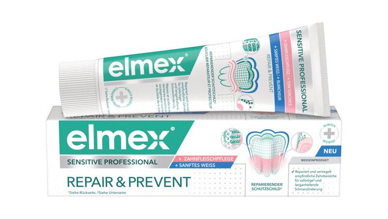 Die elmex SENSITIVE PROFESSIONAL REPAIR & PREVENT sanftes Weiss Zahnpasta bietet Patientinnen und Patienten mit Dentinhypersensibilität und empfindlichem oder gereiztem Zahnfleisch eine Lösung, ihren ästhetischen Ansprüchen im Rahmen der häuslichen Mundhygiene nachzukommen. Ein optimiertes Putzkörpersystem sorgt für eine effektive und zugleich schonende Entfernung oberflächlicher Verfärbungen und unterstützt natürlich weiße Zähne.