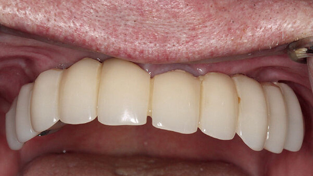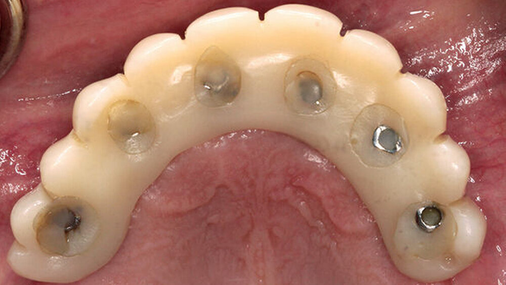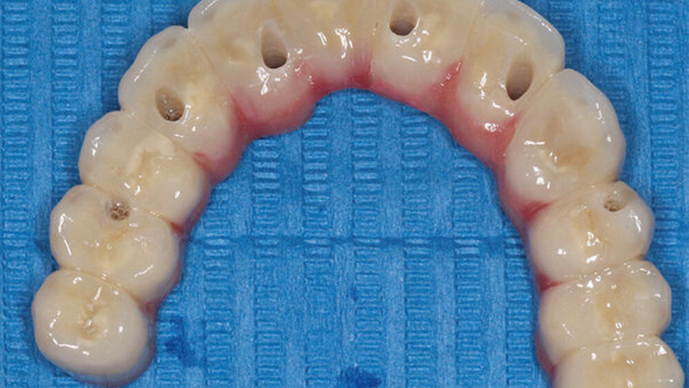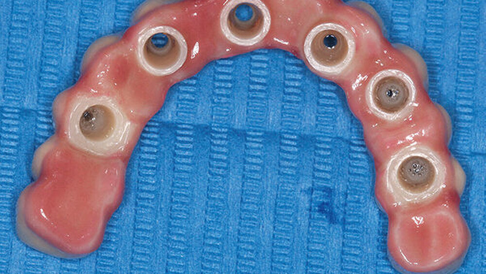 Buhtz: Wir schicken die Scan-Daten, ein Wax-up und ggf. das Modell mit den Laborimplantaten an das medentis-Fräszentrum und erhalten zwei Tage später die verschraubte Unterkonstruktion. Denta 5 gibt es bereits seit einigen Jahren. Doch erst seit wir einen eigenen Modellscanner haben, stellen wir verschraubte Brücken auf diese Weise her. Jetzt habe ich eine Zahntechnikerin, die damit gut klarkommt. Full-arch-Versorgungen sind bei uns allerdings nicht das Tagesgeschäft, wir machen das vielleicht zehn- bis zwanzigmal pro Jahr. Unsere Patientenklientel ist in der Regel nicht zahnlos.