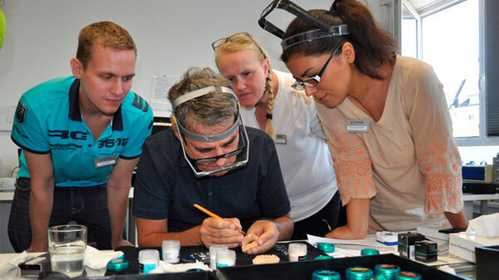 Wie gerade bei einer einzeln zu versorgenden Frontzahnrestauration optimale Ergebnisse erreicht werden können, zeigte ZTM Paul Fiechter Ende August den Keramikern des Dentallabors Flemming Nordrhein. In einem zweitägigen Kurs demonstrierte er anhand eines konkreten Falles, worauf bei der Einzelzahnverblendung zu achten ist. Besonderes Highlight: Die Patientin und der behandelnde Arzt Dr. Grote aus Krefeld kamen zur Einprobe in das Labor nach Düsseldorf. Ergebnis war, dass Dr. Grote und seine Patientin die „Qual der Wahl“ hatten.