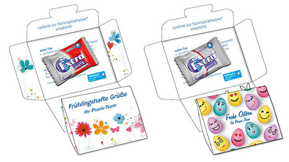 Gründliches Zähneputzen am Morgen und Abend ist der feste Grundbestandteil der täglichen Routine für gesunde Zähne, wie sie die Kariesprophylaxe-Leitlinie der Deutschen Gesellschaft für Zahnerhaltung (DGZ) empfiehlt. Zahnarzt- und Arztpraxen können ihren Patienten zur Osterzeit nach der Behandlung ein kleines Lächeln ins Gesicht zaubern und gleichzeitig Lust auf Prophylaxe machen – mit Wrigley’s Extra-Kaugummi im passend zum Osterfest und Frühlingsstart gestalteten Envelope. Mit den drei Leitlinien-Tipps zur täglichen Kariesprophylaxe auf der Innenseite – Zähne putzen, wenig Zucker, Kaugummi kauen – erinnern die Envelopes daran, beim Genuss auch an die Zähne zu denken.