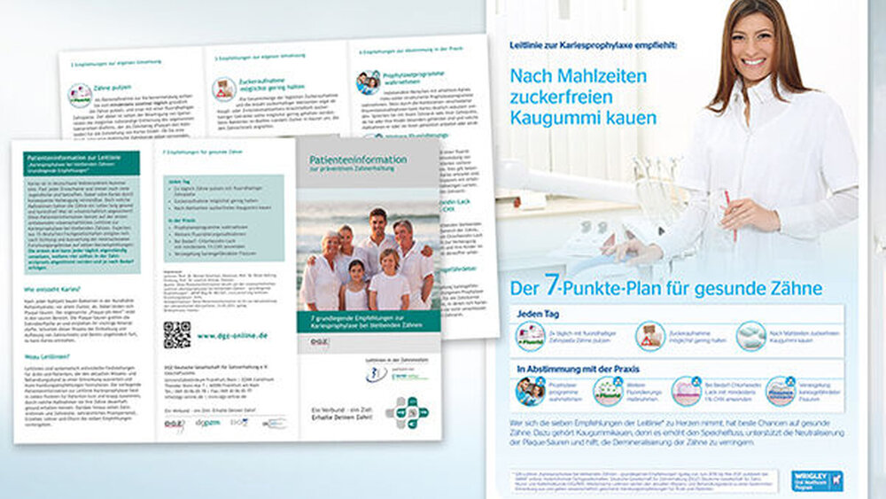 Regelmäßig nach Mahlzeiten, Snacks und zucker- oder säurehaltigen Getränken den Speichel zu stimulieren, funktioniert sehr schnell und einfach mit zuckerfreiem Kaugummi: Der aktivierte Speichel verstärkt die Spülfunktion, unterstützt damit die Reinigung der Mundhöhle von Nahrungsbestandteilen, fördert die Pufferung von Säuren und wirkt remineralisierend auf den Zahnschmelz. Dass Kaugummi immer schnell und leicht zur Hand ist, macht ihn zur perfekten „Zahnpflege To Go“. Zusätzlich dazu kann das Praxisteam den Patientinnen und Patienten mithilfe des Leitlinien-Patientenflyers alle sieben Empfehlungen der Leitlinie aufzeigen und die Broschüre anschließend mitgeben. So bleibt die Praxis in guter Erinnerung, Patienten kommen gerne wieder und empfehlen sie weiter.