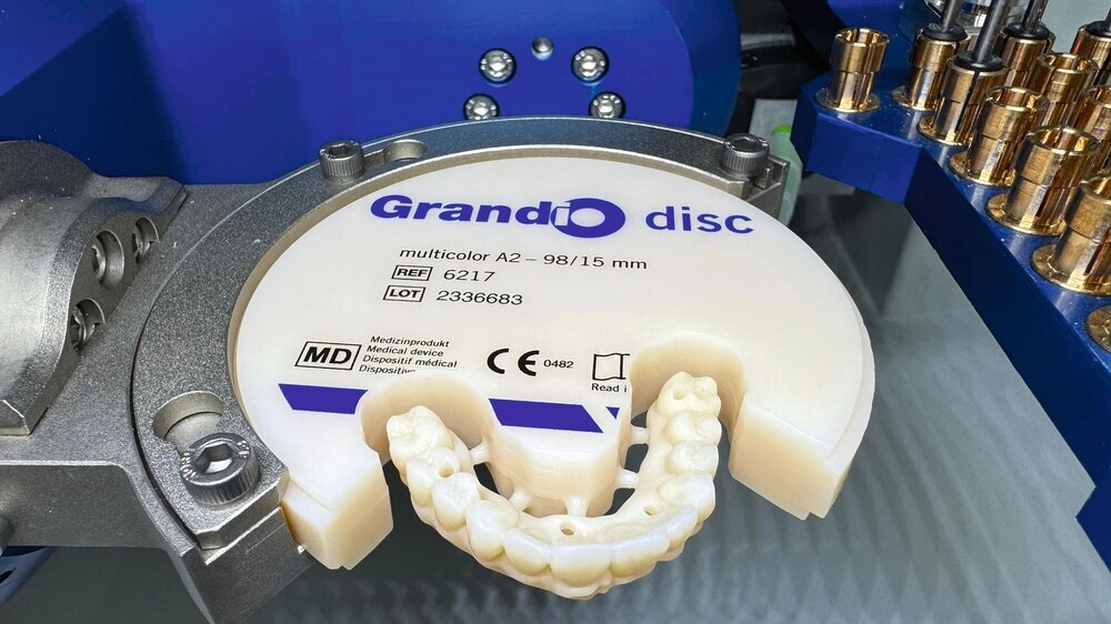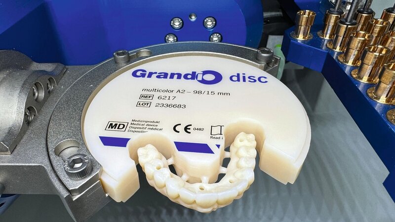 Während des Fräsvorgangs punktet Grandio disc durch hohe Kantenstabilität. Abplatzungen an den Rändern sind nahezu ausgeschlossen, Wiederholungsfräsungen entfallen. Im Gegensatz zu Zirkon können durch das Wegfallen des innenliegenden Sinterstegs sogar zwei volle Kiefer und weitere Einzelzahnrestauration aus einer Disc gefertigt werden. Die intraorale Bearbeitbarkeit und Reparierbarkeit runden das wirtschaftliche Gesamtpaket ab und bieten Labor und Praxis maximale Flexibilität bei reduziertem Aufwand.