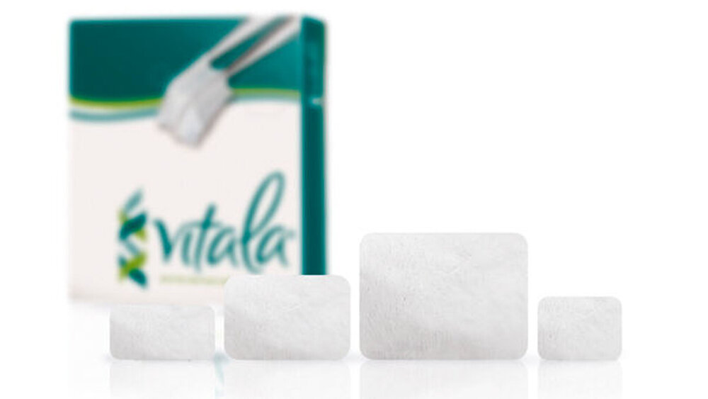 Die Resorption erfolgt nach 26 Wochen und ist somit für den Anwender sehr zeitgenau planbar. Vitala ist in verschiedenen Größen zwischen 15 x 20mm und 30 x 40mm erhältlich.