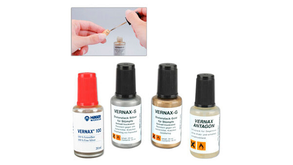 Der schnelltrocknende Lack von Hager & Werken ist mechanisch resistent, gegen alle Isoliermittel „immun“ und hitzefest beim Tiefziehen und Tauchwachsen. Der Lack ist erhältlich als Vernax S (Silber) und als Vernax G (Gold) und auch zur Verwendung an Demo- und Studienmodellen bestens geeignet.