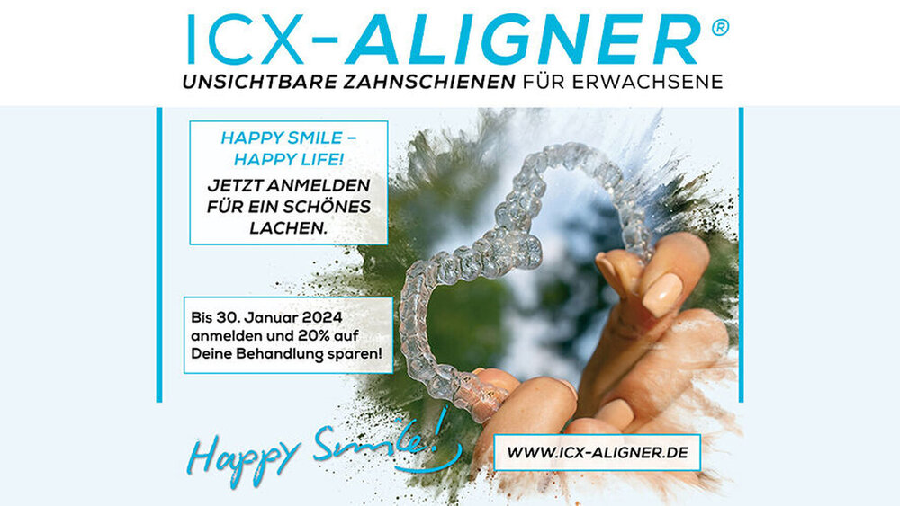 Unsere unsichtbare ICX-ALIGNER Zahnschienen sind die modernste Art der Zahnkorrektur. Sie können leichte bis mittelschwere Zahnfehlstellungen genauso effizient korrigieren wie eine feste Zahnspange. Die Schienen sind vollkommen transparent und daher unauffällig in den Alltag integrierbar.