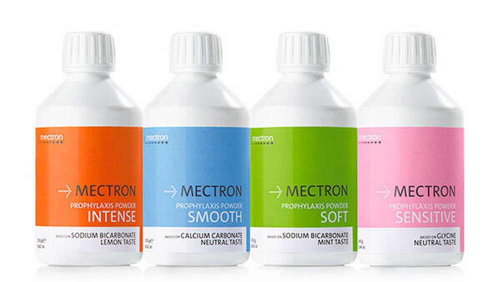 Die hochwertigen mectron Prophylaxis Powder sind in den Ausführungen Intense, Smooth, Soft und Sensitive erhältlich. Sie sind ideal zum Entfernen von subgingivalem Biofilm, zur Detoxifikation parodontaler Taschen, zur Pflege von Implantatoberflächen und zur Periimplantitis-Behandlung. Somit eigenen sie sich ebenso hervorragend zur Implantatnachsorge. Mectron Prophylaxis Powder unterstützen die Pflege von Füllungen und fördern schonend die Zahngesundheit.