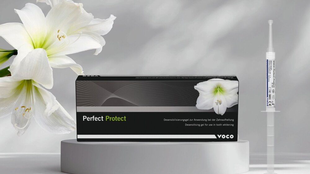 VOCO Perfect Protect ist ein Desensibilisierungsgel für die Heimanwendung, das speziell auf die Bedingungen des Home-Bleachings abgestimmt ist. Es enthält 3 Prozent Kaliumnitrat und 0,11 Prozent Fluorid und trägt so zuverlässig zur Desensibilisierung empfindlicher Zähne bei. Während das Kaliumnitrat eine Schmerzlinderung der überempfindlichen Zähne begünstigt, unterstützt das Fluorid den Verschluss offener Dentintubuli und geht somit die Ursache der Überempfindlichkeit an. Die Anwendung des transparenten und geschmacksneutralen Materials ist denkbar einfach und intuitiv: Es wird mit der gleichen Schiene wie beim Home-Bleaching für 15 bis 60 Minuten getragen und kann sowohl vor als auch nach der Zahnaufhellung verwendet werden.
