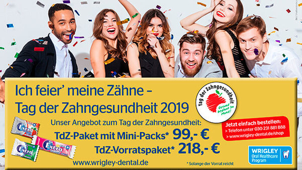Das Wrigley Oral Healthcare Program (WOHP) hält für den diesjährigen Tag der Zahngesundheit zum Mitfeiern gleich zwei Pakete für Zahnarztpraxen bereit: Eine Mini-Pack Variante mit Extra Professional White Strawberry, Extra for Kids und Extra Spearmint zum Preis von 99 Euro und ein Vorratspaket für 218 Euro. Beide werden inklusive einer kleinen EXTRA Überraschung geliefert – solange der Vorrat reicht! Mit den Paketen erhalten Praxen einen Bonus-Gutschein von 10 Prozent auf ihren nächsten Einkauf bis Ende des Jahres. Unter